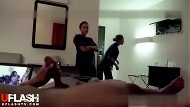 She decides to stand and watch him doing that. After a while, another room service walks inside with new towels. She looks at the show for a couple of seconds and enters the bathroom to do her work. But the first girl stands and watches until he cums.